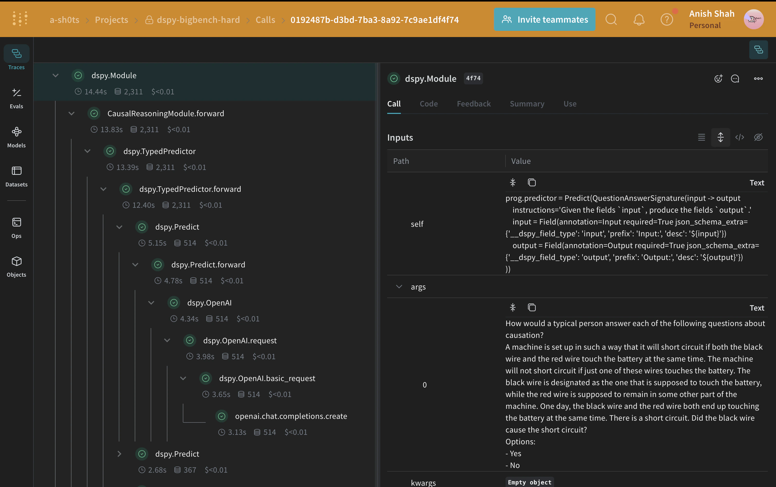 Big-Bench Hard の因果推論サブセットの例を使用して、LLM ワークフロー(すなわち CausalReasoningModule)をテストしてみましょう。